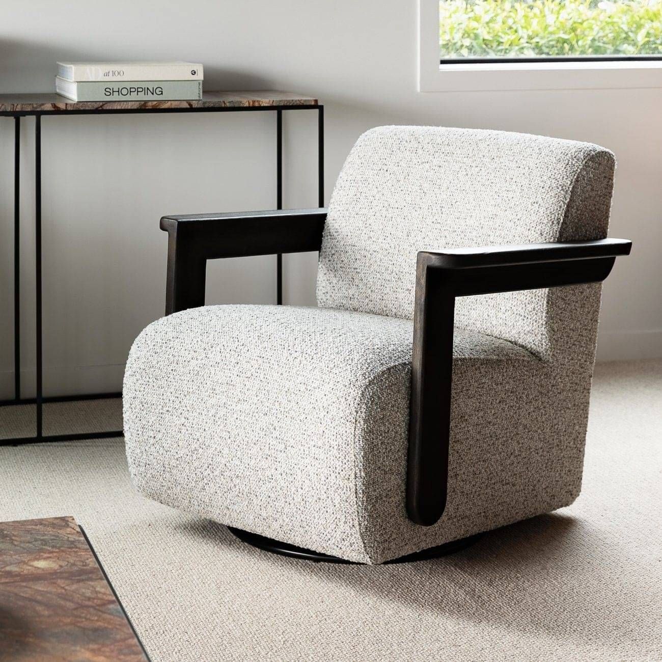 Discover the charm of retro-inspired design with the Odessa Armchair. Featuring elegantly fluted dark wood legs and a generous seating surface, it pairs style with comfort for a truly sophisticated addition to your space. Upholstered in a unique two-tone, tweed-like fabric, the Odessa evokes the timeless appeal of mid-century design with a nod to the bold aesthetics of the early 1970s.