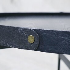 Crafted using Ash, leather and powder coated steel, then accented with brass feet and tacks and finished with a black satin lacquer.