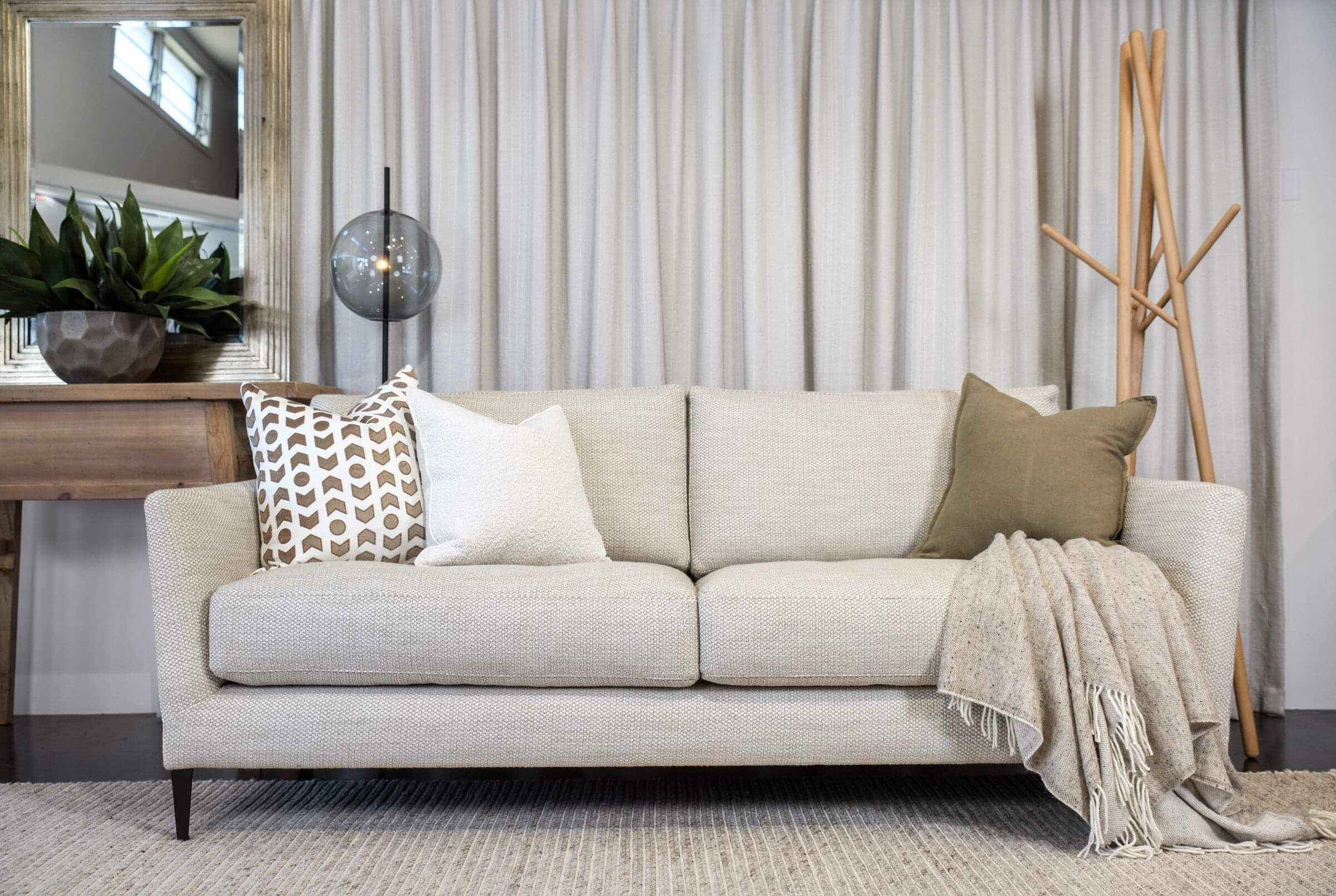 Mila's elegant design combines feather and down cushions that wrap the arm with wooden legs. Manufactured in our own New Zealand factory. Our mila sofa is constructed with sustainably grown pine, multi-density foam with feather cushions.